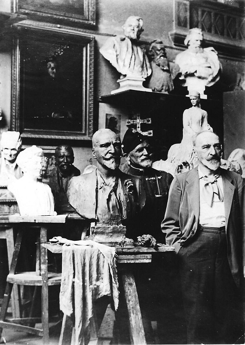 A fényképen jobbról balra: Gerbeaud Emil, Stróbl Alajos és egy készülő Gerbeaud mellszobor látható.