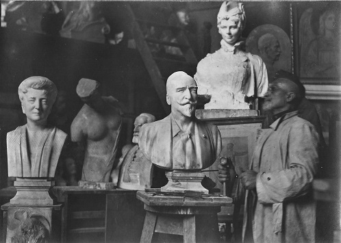 Stróbl Alajos munka közben (1917/1918 körül). A képen látható három szobor balról jobbra haladva: